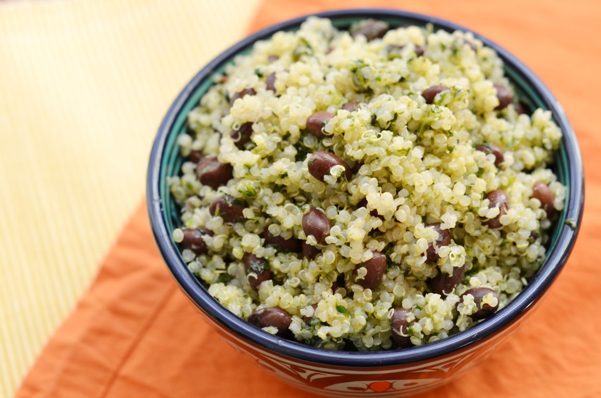 - Meanwhile, mince garlic and cilantro in food processor. Add lime juice and a light sprinkling of salt and pepper; process to combine. Add coconut oil; process again to combine. Because quinoa is like a sponge and absorbs the dressing quickly, toss the quinoa and black beans with the dressing right before serving for boldest flavor. Serve warm.