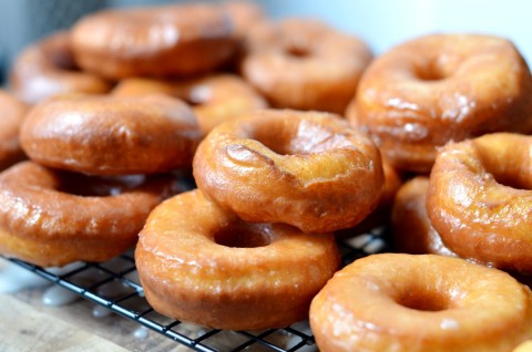 - One by one, dip doughnuts into the glaze until halfway submerged. (Note: completely submerge doughnut holes, then remove with slotted spoon.)