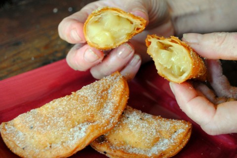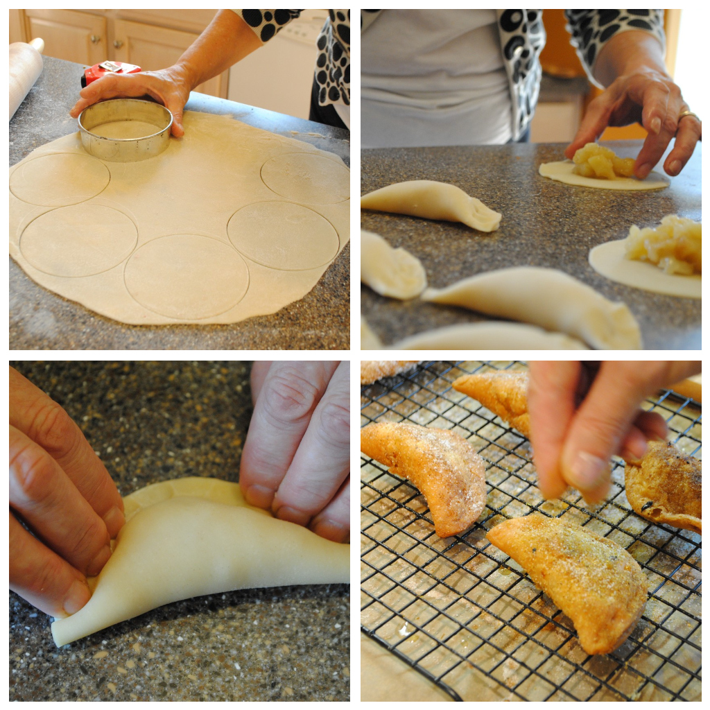 - When ready to serve, Mix remaining ½ cup of sugar with one of the spice options of your choice. working eight at a time, spoon a heaping tablespoon of the filling onto the lower center of each dough circle. Then, working on at time, brush around the edge of the lower half with water. Fold upper half of dough over filling to make a turnover, and pressing on edges to seal. Repeat with remaining, to make 16 turnovers.