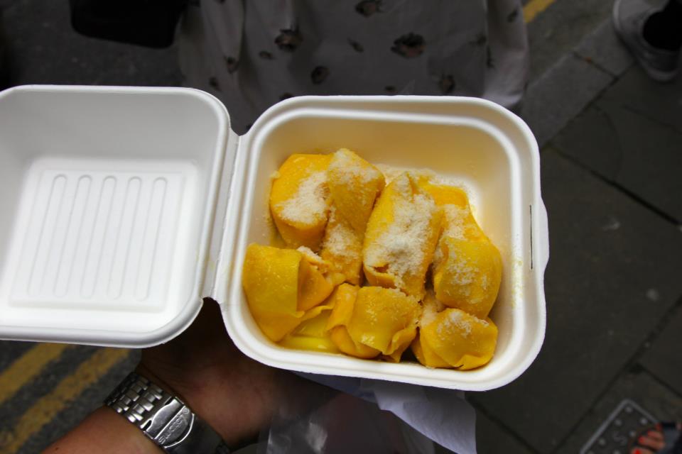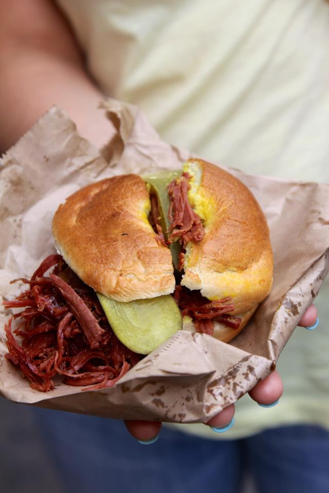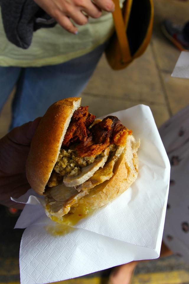 After we snagged the pasta, Naomi made a beeline for a sandwich stall. And I thought the queue for the pasta was long! We waited patiently for about 20 minutes before being served this incredible roast pork sandwich filled with stuffing, applesauce, and crackling.
