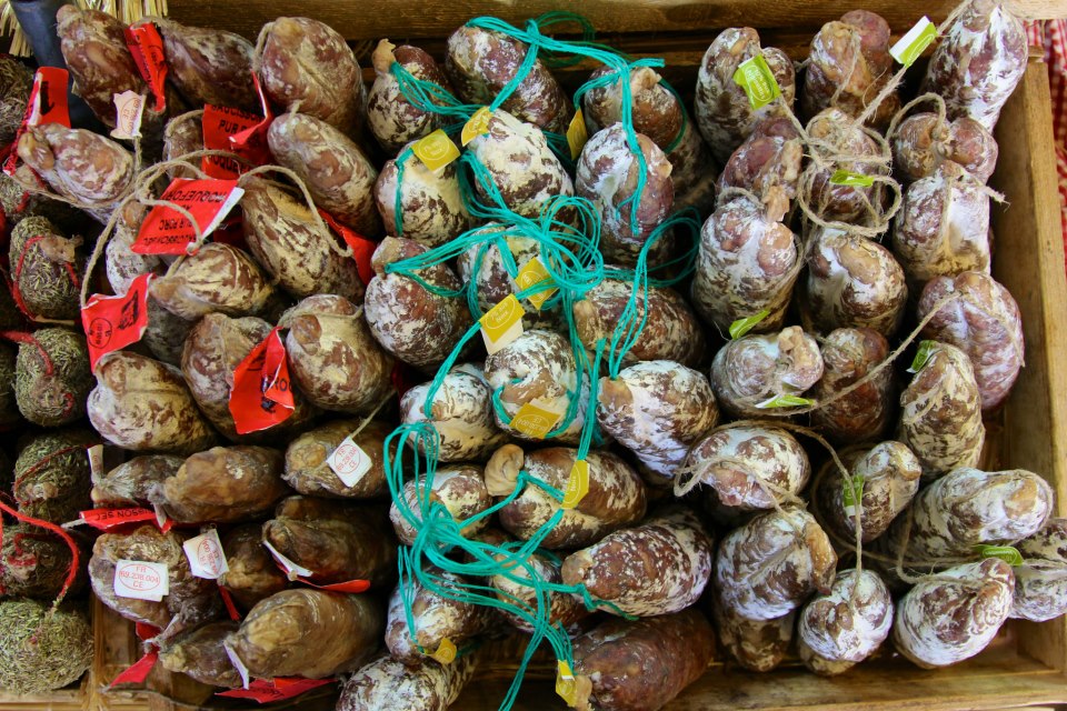 The multi-colored strings on these sausages caught our eye, and my friend Liam captured them perfectly with this top down photo.