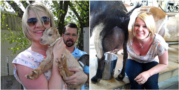 During our farm tour, we were able to hold 2-day old baby goats (cute kid overload) and afterwards were able to milk goats too! The youngest brother, Scott, showed us how they all run in and line up, eager to be milked. He opened the gate and the first group ran in, hopped up on the platform, and we were looking at some seriously large udders! I was first in line to try milking a goat by hand – they tell me I’m a natural.