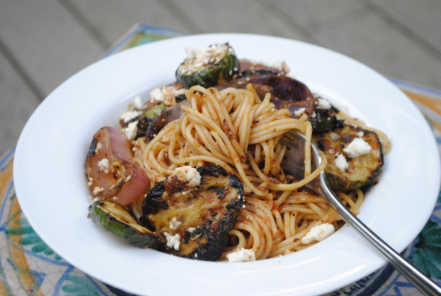 This time of year grilled pasta sauce is a favorite of mine. While the pasta water heats, grill tomato halves, a head of garlic, and sliced zucchini and red onion. After slipping the garlic from the cloves, transfer them, along with the grilled tomatoes to a food processor and whir for an instant cooked sauce. Toss some of the sauce with the grilled zucchini and onion, the remaining sauce with the pasta. Although you could sprinkle with the usual Parmesan, I prefer topping this robust pasta with more assertive crumbled feta.