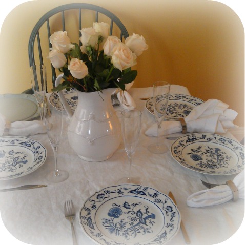 I made these scones (along with strata and salad) for my friend Wendy’s birthday brunch this weekend. Sure, we could have gone out to eat – we live in the brunch capital of the world! But nothing says “you’re important to me” like cooking a meal to celebrate someone. The table setting was modest (we even had to use a metal folding chair!), but I pulled out the good china, bought some white roses and used linen tablecloth and napkins. And these scones, fresh from the oven, were a big hit. I even let Wendy take home the last two. Now that is love.