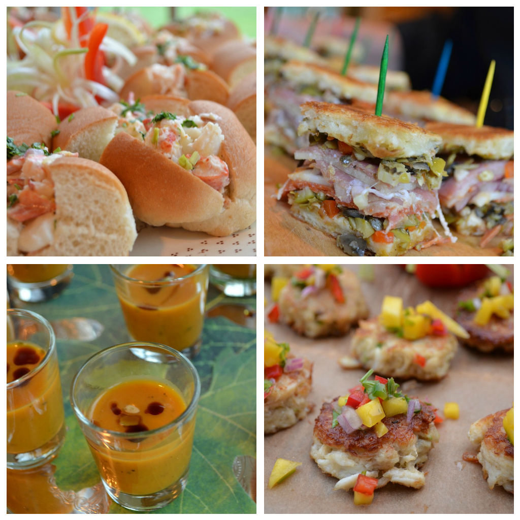 Since we knew our friends well, we planned a menu that was significant for them and relatively easy for us to pull off. The appetizers were from all the places they loved—Lobster Roll Sliders from Maine, Muffuletta Foccacia Squares from New Orleans, Austrian Roasted Pumpkin Soup which I served shooter-style garnished with roasted pumpkin oil and seeds, crab cakes with a mango salsa to remember their time in the Caribbean, a big platter of French cheeses.
