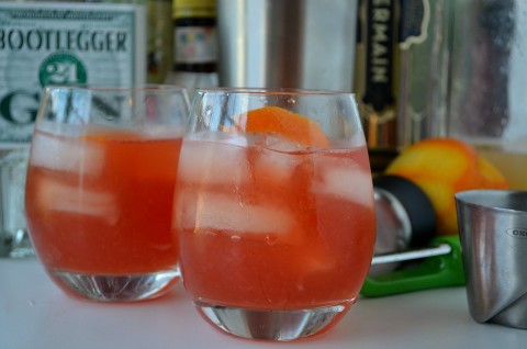 While I was kicking myself for such poor planning, others were ready for some drinks! I started off a couple classics I knew well—and that my supply would allow. But after dinner, folks started requesting more, uh, interesting things. I received two requests for the bartender’s choice. “Shit,” I thought, “what the hell am I going to make!?” Instead of admitting my packing error, I brought out a bunch of bottles and citrus and got to work. Riffing on a basic template in the Death & Co. book, I made a drink I thought would have wide appeal: a backbone of gin and grapefruit juice, some body from sweet vermouth, a little Campari for bitterness, and a touch of St. Germain to bring in floral notes. I added a dash or two of Angostura bitters to round it out and garnished with an orange peel. The proportions were pretty good, so I knew I could keep working to refine the drink. As I tinkered with the next batches, I finally reached something worthy of a recipe—a drink in which all the ingredients harmonized well.