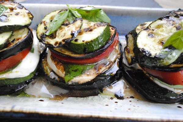 - As soon as vegetables come off the grill, assemble napoleons in the following order: 1 slice eggplant, 2 to 3 slices of zucchini, 1 slice mozzarella, a few basil leaves, a tomato slice, another eggplant slice and a few more zucchini slices. Lightly drizzle napoleons with remaining tablespoon of olive oil and the balsamic vinegar. Serve.