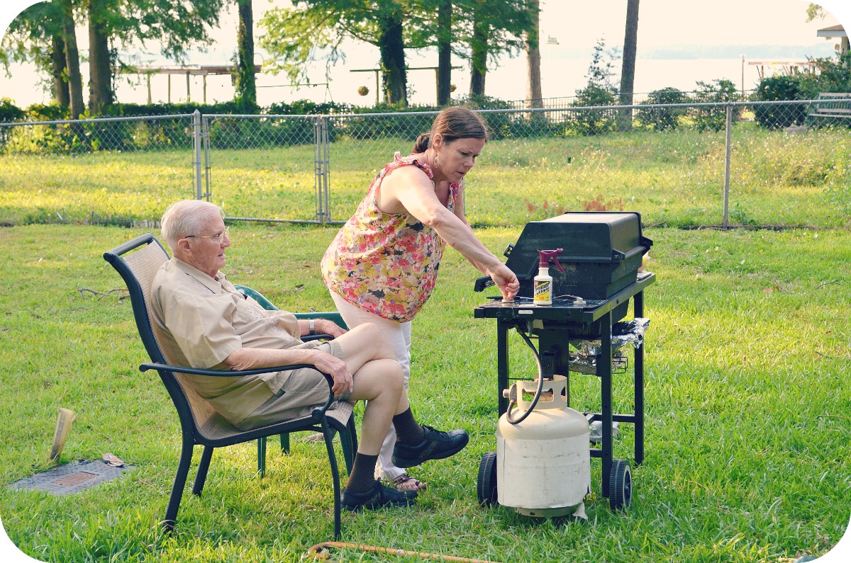 David pulled the grill out of the tool shed and got it set up in shade. He got a chair so Dad could sit. Then he and the kids headed off to the store for a few last-minute ingredients. It was just Mom, Dad, and me left to make the meal.