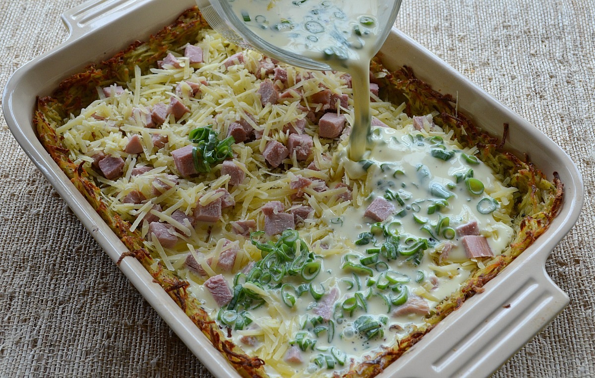 While the potato crust roasted to golden brown in a high-temperature oven, I prepared the remaining ingredients. Four of my twelve guests were kids, so I kept flavorings classic and familiar–ham and cheese–adding scallions for mild flavor and good color.