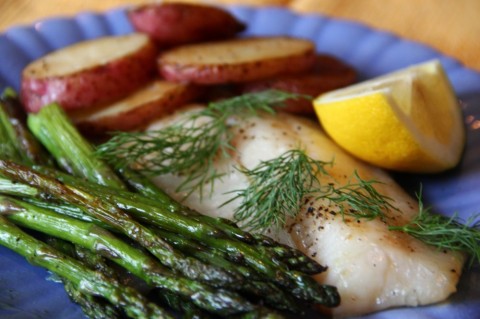 - Spray a large (12- by 18-inch) rimmed baking sheet with vegetable cooking spray. Lay fish, asparagus, and potatoes in a single layer on cookie sheet. Drizzle with the oil and lightly sprinkle with salt and pepper. Shake pan to evenly distribute. Set pan on bottom oven rack and turn oven to 400 degrees.