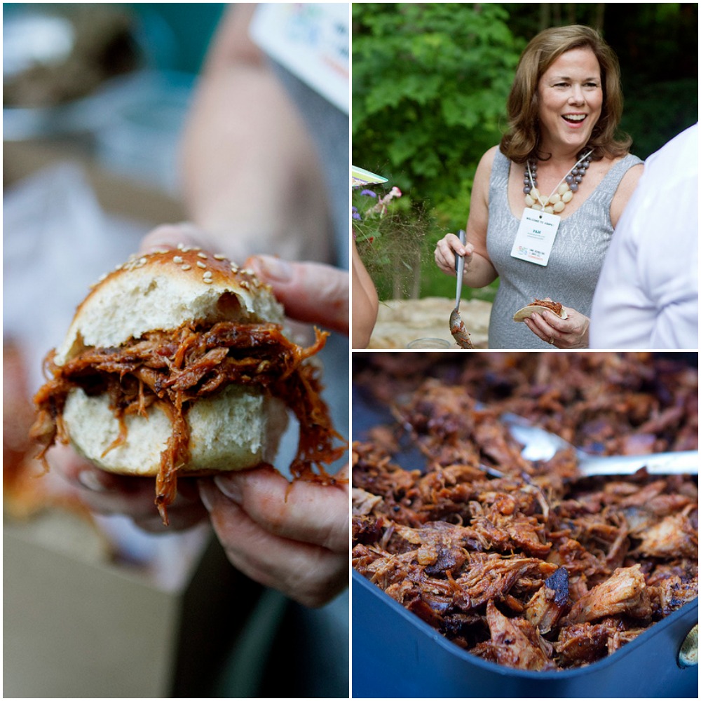 We always make one main dish that’s big enough to serve the crowd and makes all the other potluck side dishes and desserts hang together, the ‘anchor piece’ Mom calls it. Last year it was fried chicken. This year it was this smokey oven-barbecued pork on slider rolls or tortillas (we had both!), and it was a huge hit. A lot of people asked for the recipe, so we knew this would have to be the potluck recipe we shared here on Three Many Cooks. What makes it special is that it’s slow-roasted in the oven and then pulled, at which point you smoke it for just fifteen minutes on a gas grill. The pulled pork just soaks up the smoke like a sponge.