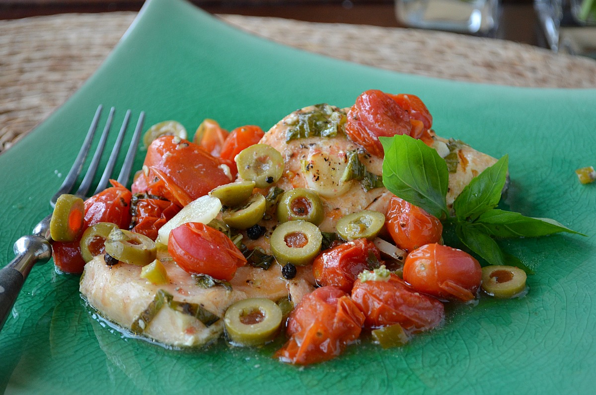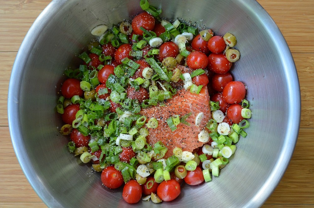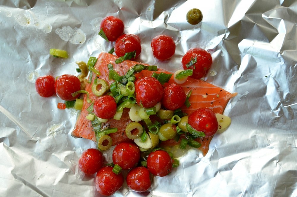 Well maybe I had enough energy to make one dish, and that’s when I remembered my foil pack technique.There was a side of salmon in the fridge and a big bowl of cherry tomatoes on the countertop. I had the staples–olive oil, garlic, scallions, olives, and some dry sherry With a nice hunk of bread, we had dinner.