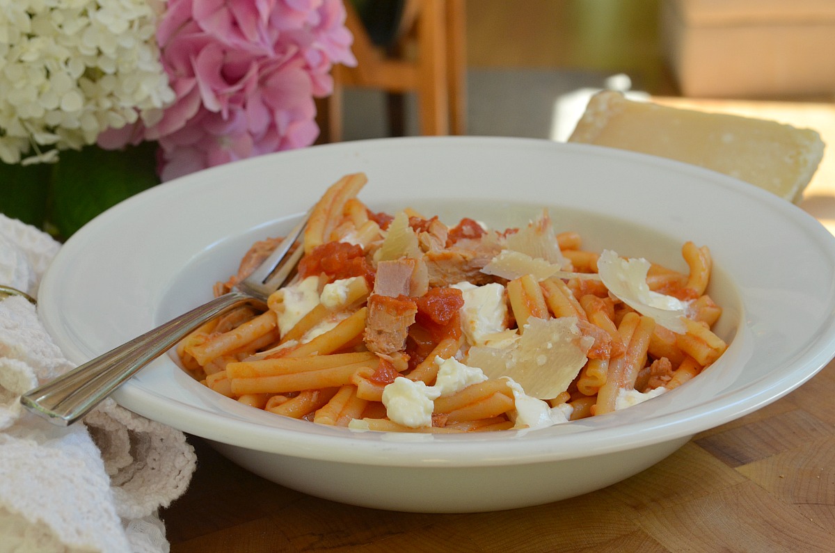 For now, here’s a recipe for Tuna Pasta with Burrata, a simple and satisfying supper. I tasted a similar dish while in Chianti with my dear friends, Deb and Rod Smith, when we were in Italy last month on a Jovial Culinary Getaway. In fact, I ordered the homemade papardelle with wild boar ragu (I’m a sucker for anything with the word “ragu” in it) and they ordered the tuna pasta with burrata. But when our plates arrived, I knew they had “won” the lunch-ordering game. Like most Italian dishes, there were so few ingredients but the combination was perfection – a light but potent tomato sauce, flavorful, good quality tuna, and the creaminess of the burrata which you stir into the dish. This is my attempt to recreate it at home.