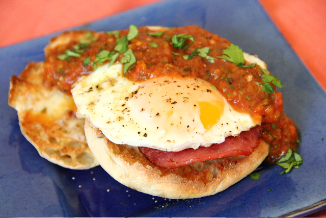 For bigger appetites, you may want to add an extra egg and slice of Canadian bacon to the second English muffin half. There’s enough salsa for 4 big breakfasts, but if you have some leftover, it’s great with tortilla chips or on top of grilled chicken.