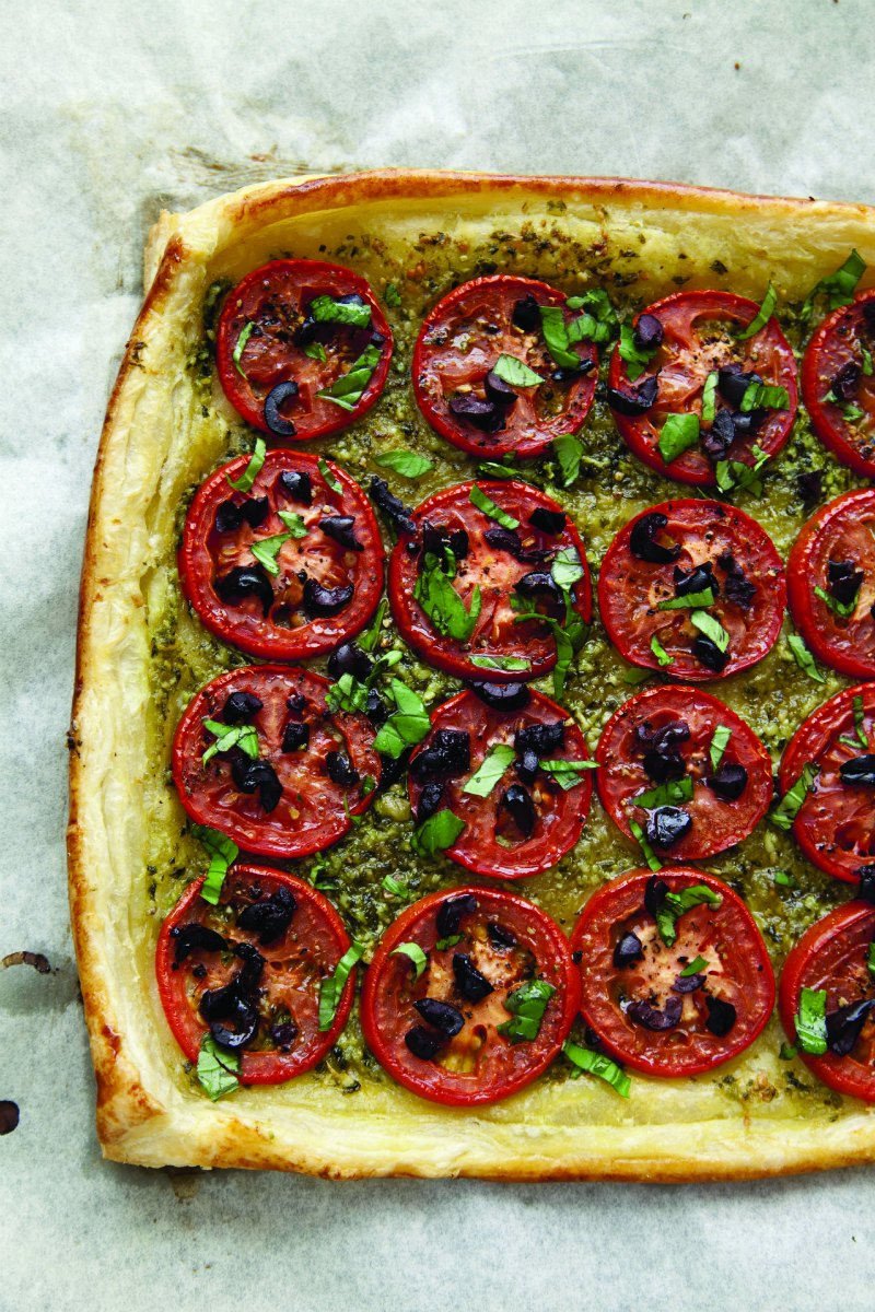 - Spread the pesto evenly over the pastry (avoiding the rim), using a pastry brush or the back of a spoon. Arrange the tomato slices in a single layer over the entire square, within the rim. Season the tomatoes lightly with salt and pepper, and sprinkle the chopped olives over them.