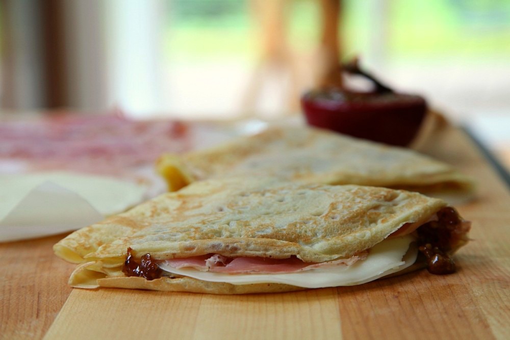 Working one at a time, spread a tablespoon of the fig mixture over the bottom half of each crepe. Lay a thin layer of prosciutto and cheese over the fig mixture.