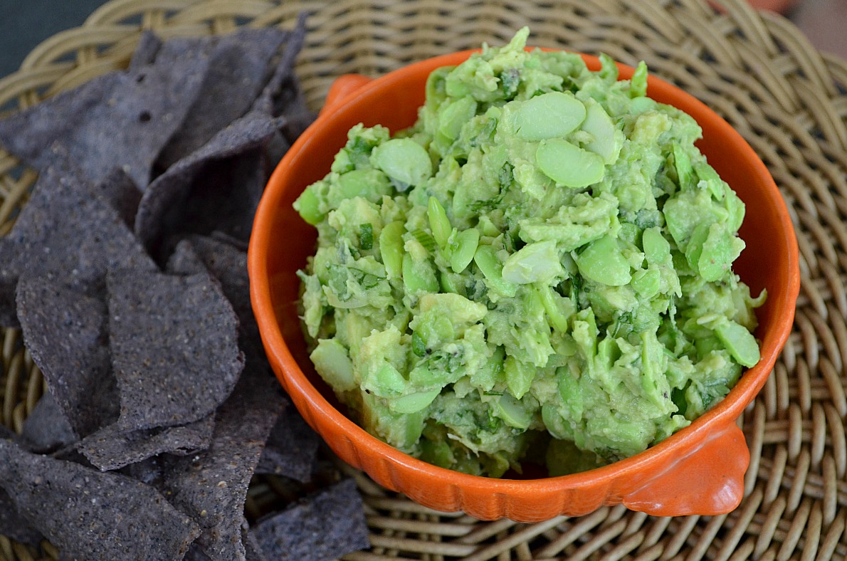 Serve this Edamame-Avocado Guacamole with I-Cant-Believe-They’re-Not-Fried Tortilla Chips