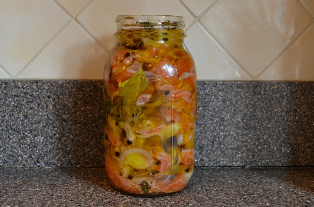It appears to be a spin on Selyodka, which is basically deboned salmon strips, submerged in 5%+ vinegar (with personal choice flavours), refridgerate 3 days, remove salmon, pat dry (IE kitchen roll), slice up some onion (again type is your choice), throw in some sliced chillies, etc if you want. Get properly cleaned jars, start with onion layer, then salmon till full, finish top with onion(helps keep salmon submerged), pour in oil (I use sunflower with good dash extra virgin olive), fill to near top, make sure to get rid of air bubbles as you go, and keep salmon below surface, put lid on, keep in fridge. Ready to eat immediatly, lasts a few months properly stored, etc.