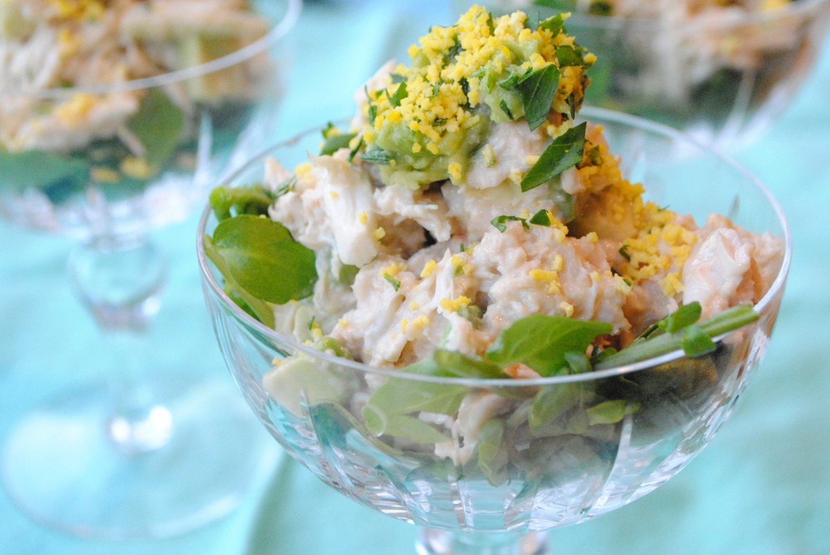 - Line champagne flutes or plates with watercress. Top with crab mixture, a dollop of mashed avocado mixture, and a sprinkle of yolk mixture. Mimosa can be covered and refrigerated for up to 3 hours.