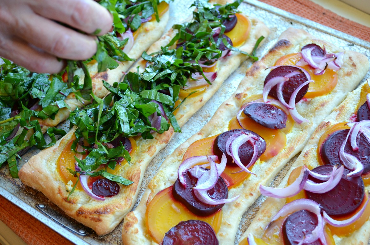 - Bake until crust is golden, about 10 minutes. While pizzas bake, toss separately the beets and red onion with a light drizzle of olive oil and a light sprinkling of salt and pepper. Remove pizzas from oven and arrange beets first, and then red onion onto each; return pizzas to oven. Continue to bake until pizzas are crisp and golden brown, 8 to 10 minutes longer.