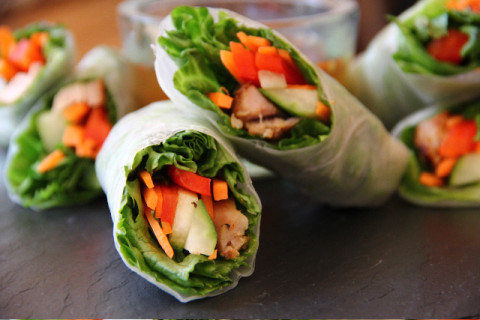- Working 1 at a time, lay a couple of pieces of lettuce leaves on a work surface. Top with a few pieces of chicken, followed by a couple of strips each of cucumber and red pepper, and a bit of shredded carrot (there really are no exact proportions here). Top with a few cilantro sprigs and a few mint leaves. Dip a sheet of rice paper in the warm water for about 5 seconds. Lay on work surface, and then transfer topped lettuce to lower third of the softened rice paper. Lift bottom of rice paper over filling and roll as tightly as possible to form a taut tube. If spring roll is not rolled as tightly as you like, roll it in a second soaked rice paper.