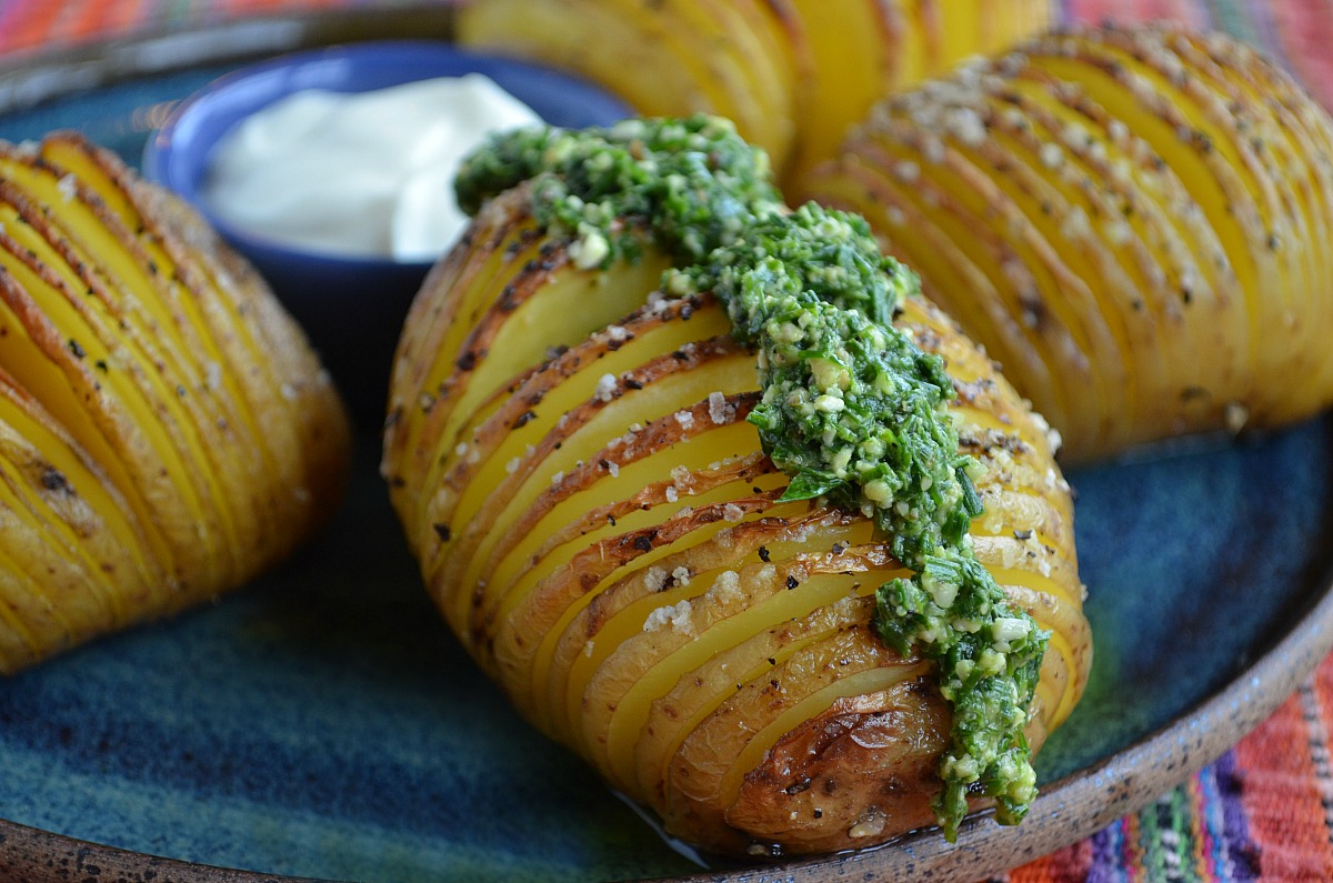 Hasselback Potatoes with Sour Cream and Chive Pesto