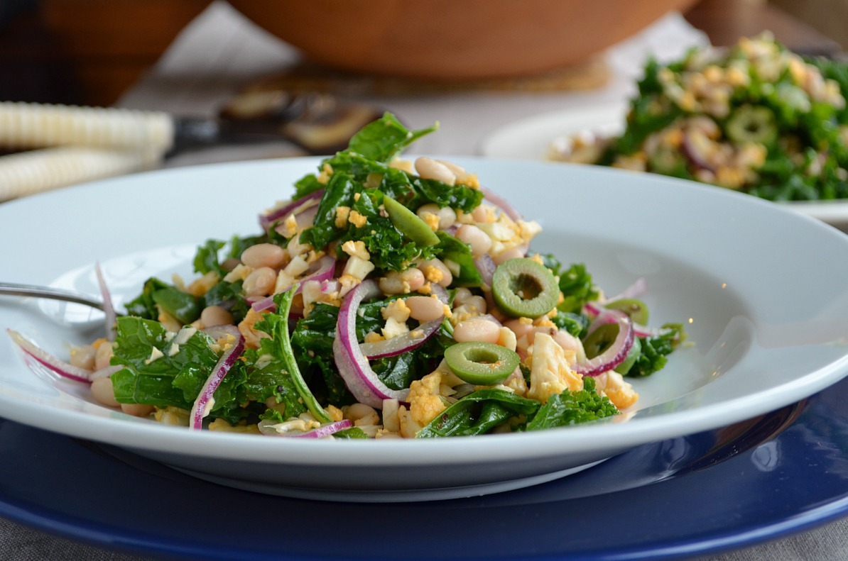 - Place kale in a large bowl. Add 2 teaspoons of the oil and rub leaves to coat. Add cauliflower, beans, olives, and onion. Drizzle with remaining 2 tablespoons of oil and a generous sprinkling of salt and pepper; toss to coat. Drizzle with vinegar; toss to coat again. Taste, adjust seasonings, and serve.
