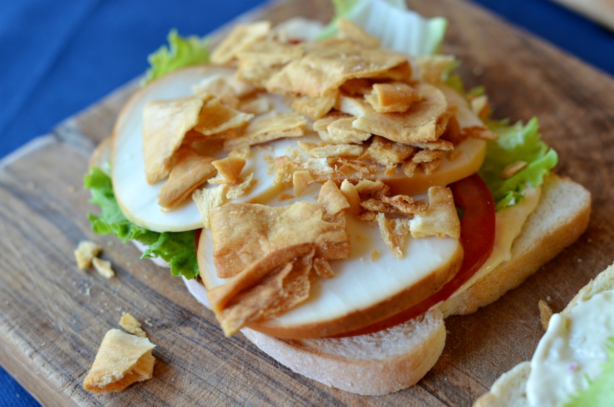 - Spread a portion of mayonnaise on each piece of toast and top with lettuce. Top 4 of the toast slices with tomatoes, cheese, and pita chips; cap with remaining 4 toast slices. Halve and serve.