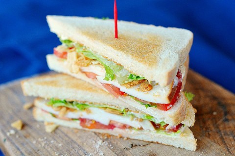 Three things make this Meatless BLT great: smoked mozzarella, crumbled pita chips and Maggy’s special sauce–a mix of mayo, Dijon, and grated red onion–a recipe she picked up when working at a London pub a few years back. The smoky rich cheese coupled with the crumbled pita chips making pretty convincing bacon, and the sauce heightens the sandwich’s flavor.