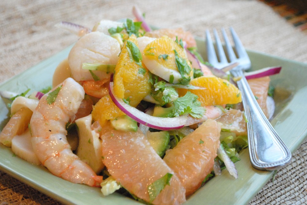I’m especially enjoying citrus and avocado-based salads this winter. I served the salad first, sans seafood, as a New Year’s Eve starter, and I’ve made it as a main course with seafood three times since.
