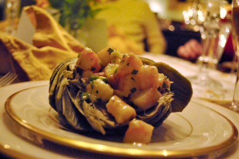 - Following steps at http://simplyrecipes.com/recipes/how_to_cook_and_eat_an_artichoke/ prepare and cook artichokes. Halve each artichoke, scooping out the fuzzy inedible part called the "choke." (Can be covered and refrigerated overnight.)