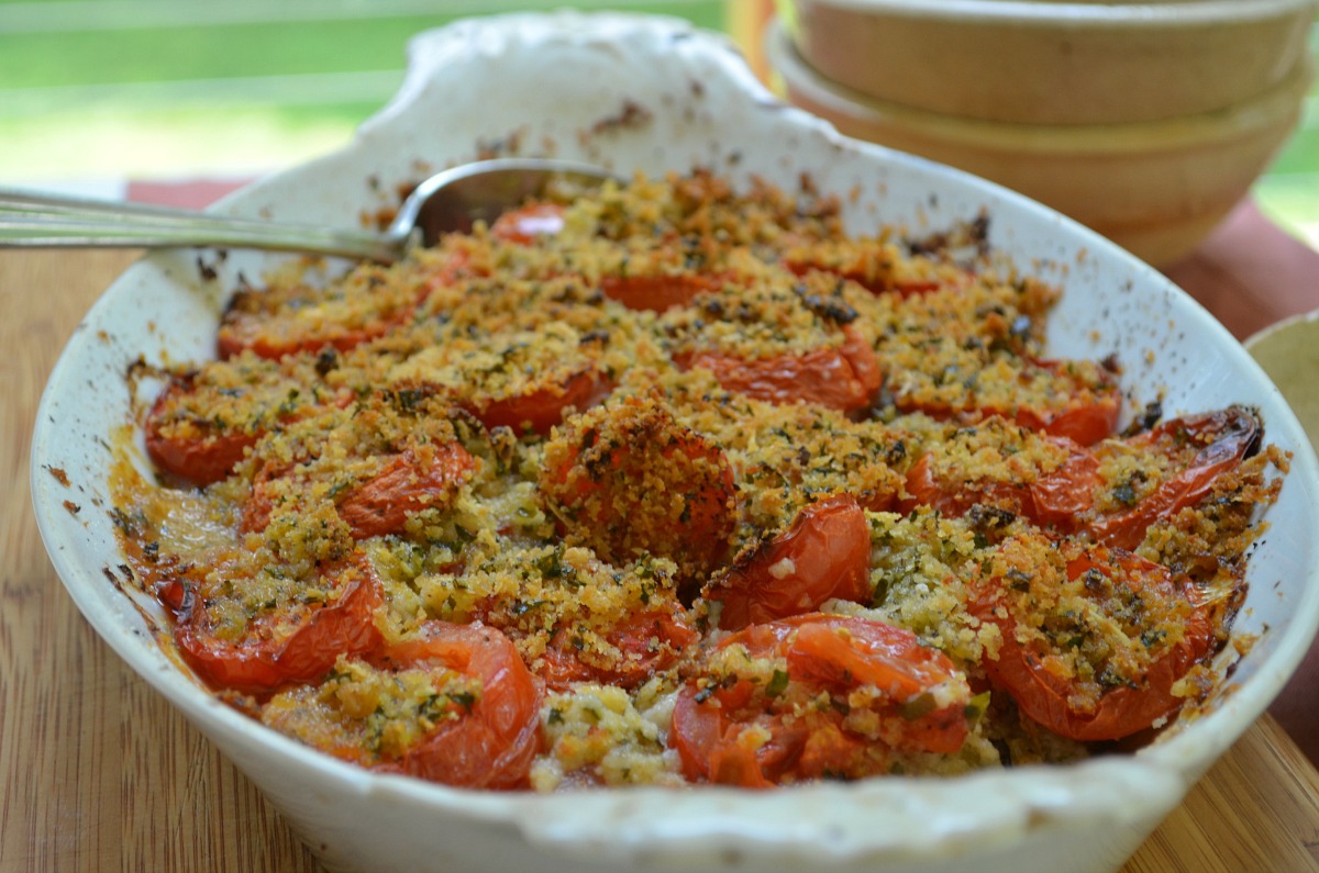 - Bake tomatoes until they have noticeably reduced in pan and top layer of bread crumbs are golden brown, about 1 hour. Let rest a few minutes and then serve.