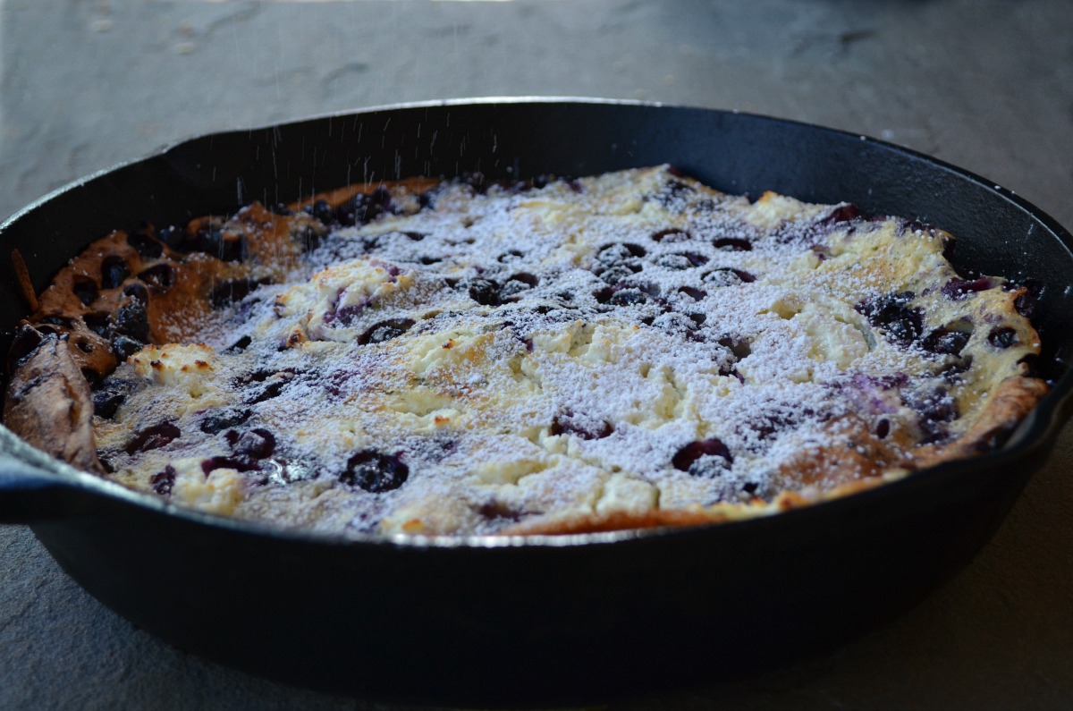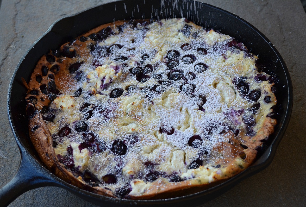 - Meanwhile heat oil in a heavy-bottomed 12-inch skillet (cast iron works well). Add blueberries to hot pan; sauté until heated through, a minute or so. Add milk mixture and sprinkle with goat cheese. Transfer to the oven and bake until puffed and golden, 15 to 17 minutes. Remove from oven and immediately dust with sugar. Serve from the skillet with additional confectioner’s sugar passed separately.