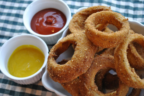 - Heat oven to 200 degrees. In a soup kettle, heat oil to 350 degrees. Set a rack over a baking sheet. Drop rings one at a time into oil, fitting in four or five per batch. Cook for 2 minutes, or until rings are a rich brown, turning halfway through cooking. Transfer to rack, sprinkle with salt and serve. (Can be held in a 200-degree oven up to 30 minutes.)