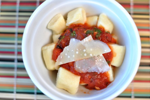 - Working in 2 batches, add gnocchi to boiling water; cook until gnocchi float and then swell. Remove with a slotted spoon; keep warm. Cook remaining gnocchi. Serve, sauce, sprinkle with Parmesan cheese, garnish with additional basil, if you like, and serve.