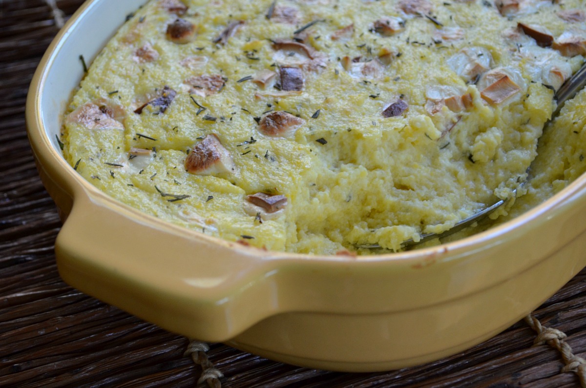A good Southerner, I immediately thought of grits in casserole form. Everyone was a little skeptical, especially Maggy, since she knows her husband Andy is not a grits fan. (Interestingly, he loves polenta and continues to disparage grits even after being told that grits and polenta are the same.) Polenta casserole it would be. It was still corn season, so I stirred a little into the casserole and set out a jug of maple syrup for drizzling.