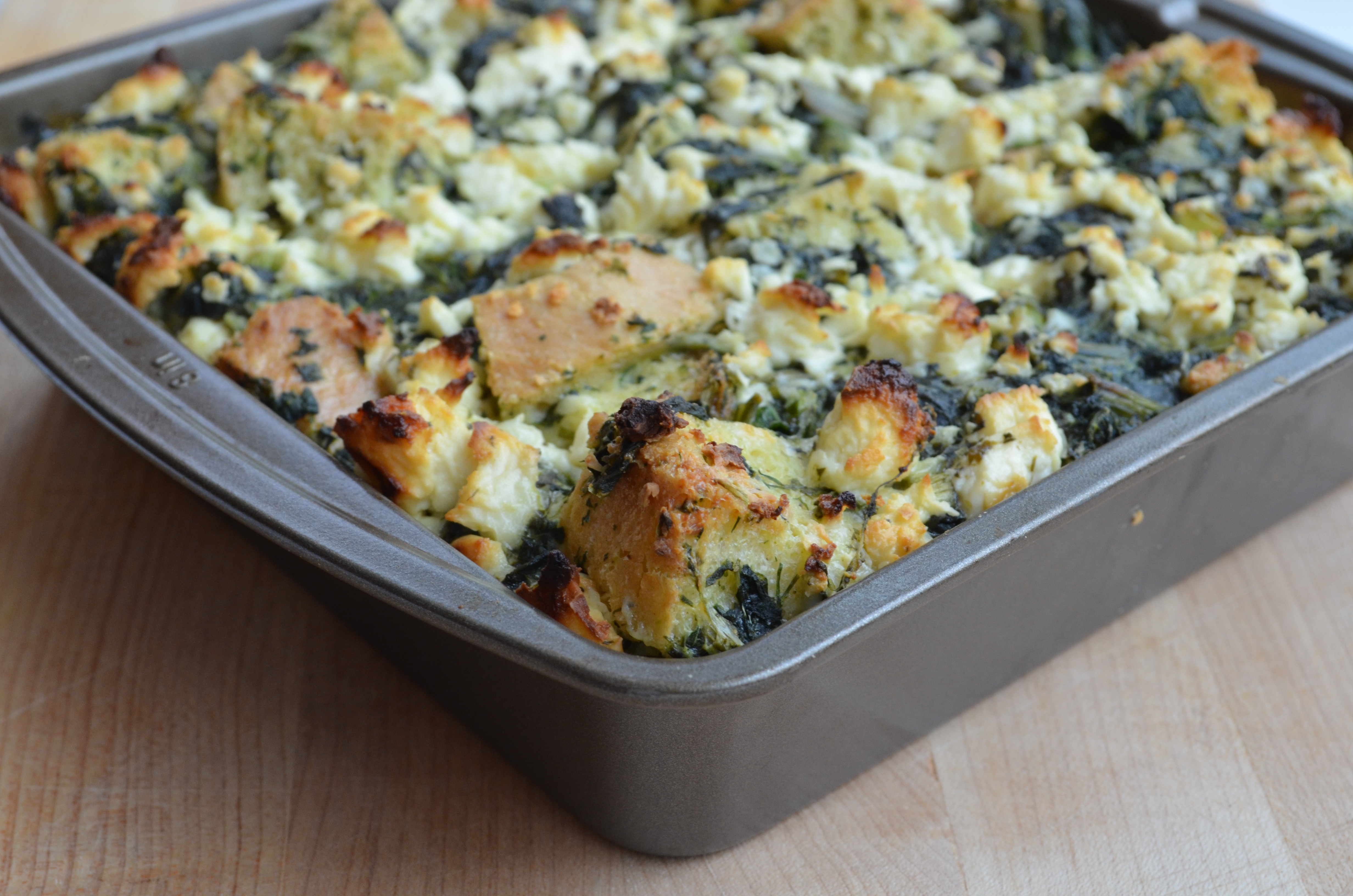 Because strata is so mild–it’s just eggs, milk, and bread–potent cheese is key. Typically I use sharp cheddar. Here’s where I needed to make it different. My mind went down the cheese list and landed on feta. From there the rest came tumbling out–spinach, dill, scallions.