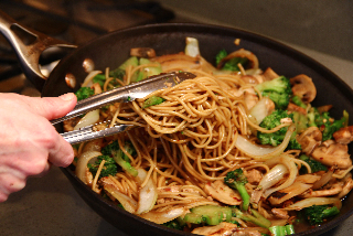 - Meanwhile, turn on vent fan and heat a 12-inch nonstick skillet over high heat until very hot. Add 1 tablespoon of oil and the onion; stir-fry until crisp and spotty brown, about 1 minute. Add mushrooms; stir-fry until just cooked, about 2 minutes. Add tofu; stir-fry until lightly browned, about 1 minute longer. Add broccoli; cook until heated through, about 1 minute. Add garlic and ginger; stir-fry until fragrant, about 30 seconds. Transfer to a plate and add remaining 1 tablespoon of oil to the empty skillet; heat until shimmering. Add spaghetti; stir-fry until heated through, about 2 minutes. Return meat/vegetable mixture to pan, along with Lo Mein sauce; stir-fry to combine. Serve immediately.