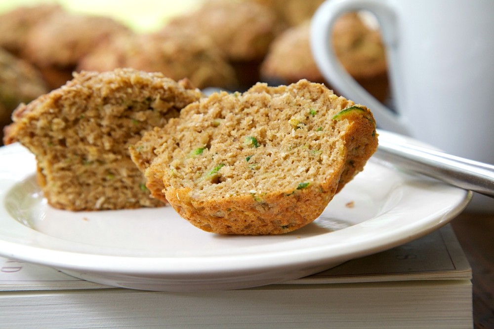 As the zucchini piled up on my countertop last week, I started making zucchini bread, which I enjoyed (as did everyone in my office). After making a couple of loaves I realized quick breads felt like an occasional afternoon indulgence with tea. What I needed was a recipe for a healthy breakfast muffin, and it didn’t take long for me to find it. I headed over to Sharon’s Spiced Carrot Muffins, which are a little bit naughty, but mostly just nice. I swapped carrots for zucchini and subbed in coconut oil for vegetable oil. Because I almost always have Greek yogurt in my fridge, I thinned it with a little milk and used it in place of plain yogurt. I edited the spices too and added some dried coconut to the mix. With only 2/3 cup brown sugar for twelve muffins, I felt downright virtuous eating one of these!