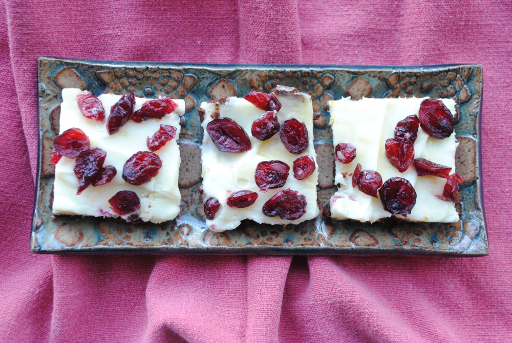 You can’t have a cookie spread with out brownies, but I wanted one with a holiday feel. Inspired by Starbuck’s Cranberry Bliss Bars, I made a thinner version of my brownie, topped them with an orange-flavored cream cheese frosting, sprinkled them with cranberries, and a little glaze for good measure.