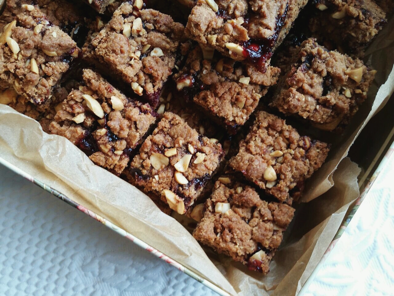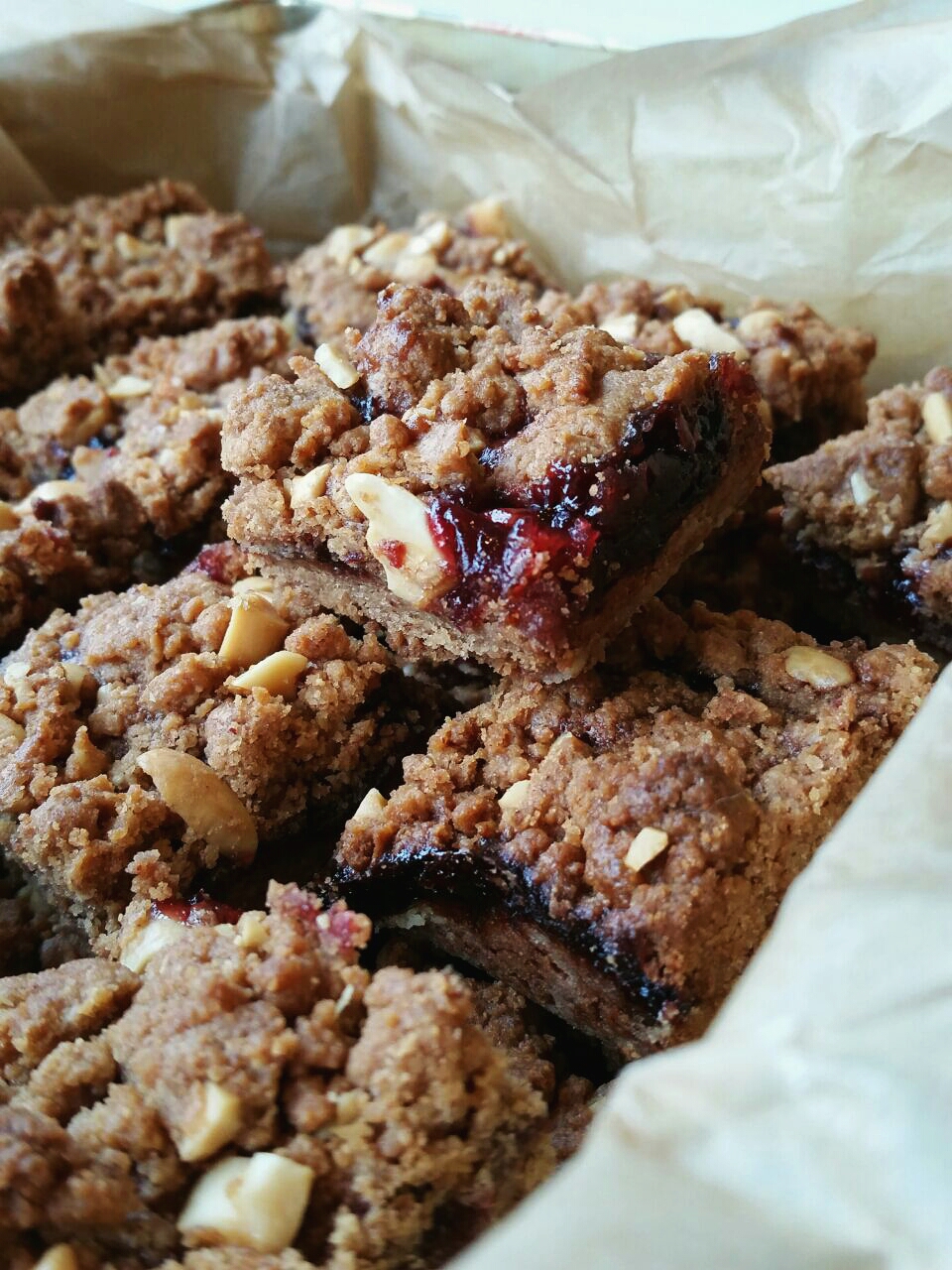 - Press ⅔ of the peanut butter dough into the prepared pan; spread jam over the dough to cover. Mix peanuts into remaining peanut butter dough, crumbling it over the jam to form a topping